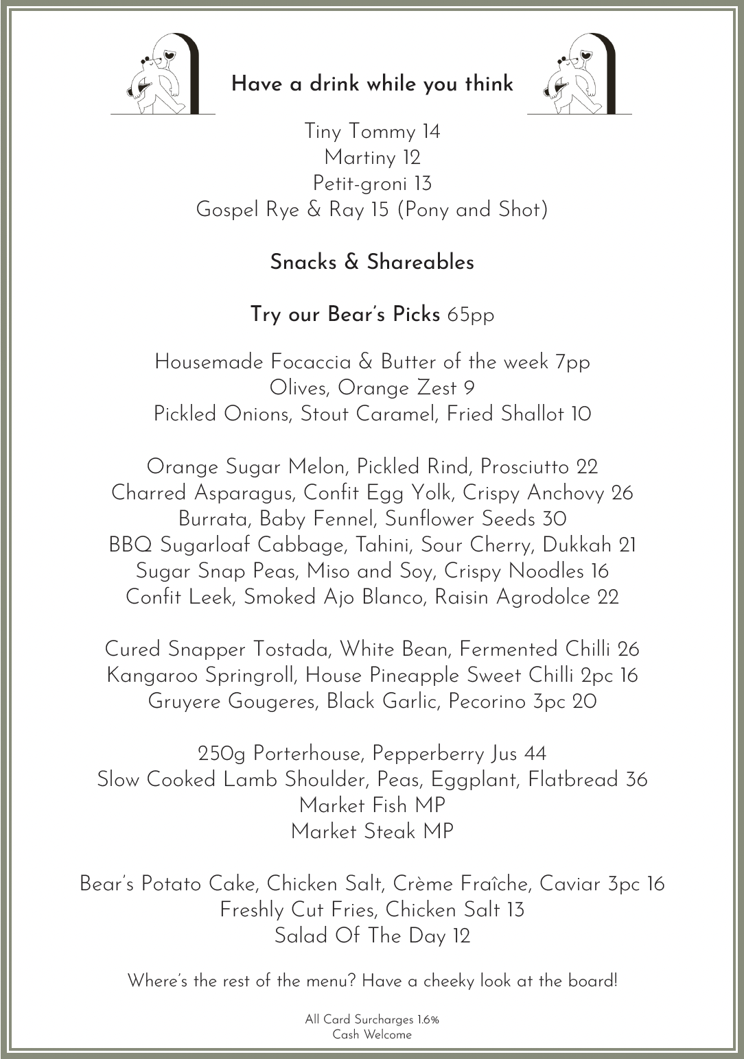 At Bears Wine Bar, we respectfully acknowledge the Traditional Owners of the land we gather, the Wurundjeri Woi Wurrung people of the Kulin Nation. We respect their past, present, and emerging Elders and recognise their continuing connection to the land, water, and culture. We extend this respect to all Aboriginal and Torres Strait Islander peoples and their rich storytelling, community, and hospitality traditions.